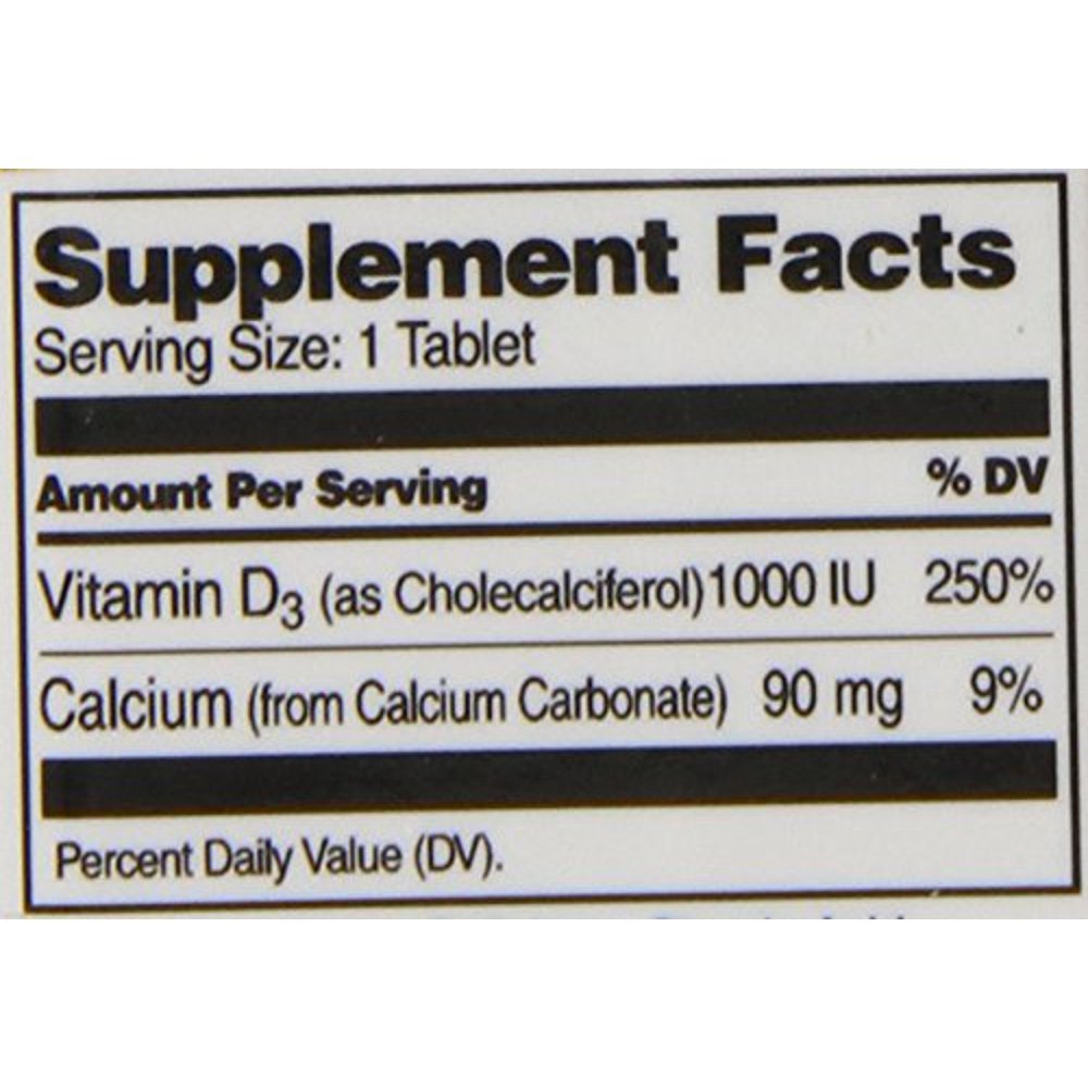 Ingredients: 1 Tablet: Vitamin D3 (as Cholecalciferol) 1000 IU; Calcium (From Calcium Carbonate) 90 mg; Cellulose; Stearic Acid; Croscarmellose Sodium; Silicon Dioxide; Magnesium Stearate