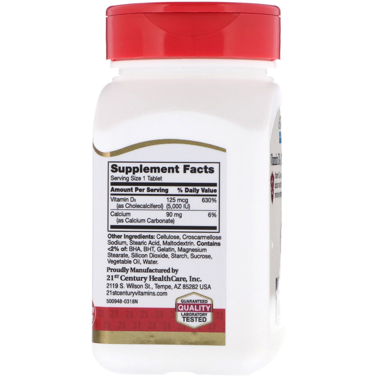 D3-5000IU, Maximum Strength, Tablets, Bottle 110 CT Vitamin Supplement. 10% free. Promotes bone, immune, breast and colon health. 21st Century – for a healthier future. Vitamin D3 is essential for absorption of calcium and necessary support for healthy bones, teeth and immune system. Vitamin D3 also supports breast and colon health. Gluten free. No added sugar, yeast, preservatives or artificial flavors. Guaranteed quality. Laboratory tested. www.21stcenturyvitamins.com. (This statement has not been evaluated by the Food and Drug Administration. This product is not intended to diagnose, treat, cure, or prevent any disease.) For adults, take one (1) tablet daily, preferably with a meal for maximum daily results, or as directed by your healthcare provider. Do not exceed recommended dosage. Store at room temperature. Keep out of reach of children. Do not use if product appears to be tampered with or seal is broken. 110 tablets 2119 S Wilson Street Tempe, AZ 85282