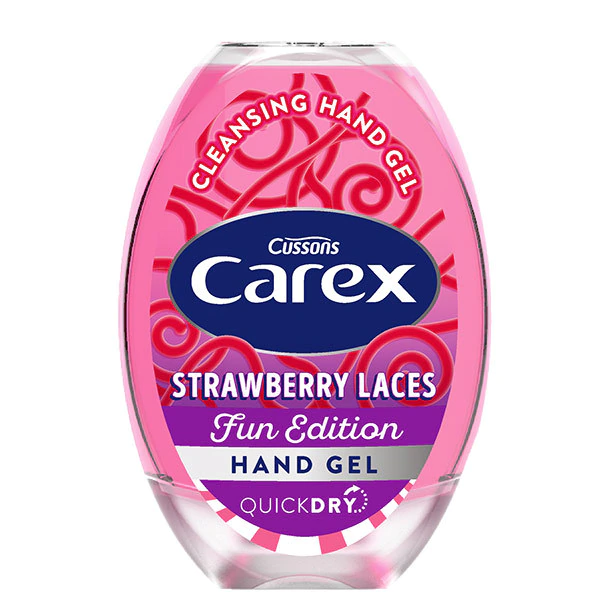 Carex Complete, Strawberry Laces alcohol based Hand Gel with our ‘Fun Editions’ fragrance Cleans, Cares and Protects , so you and your family can feel free to ‘Live Life Hands On’, wherever you go.