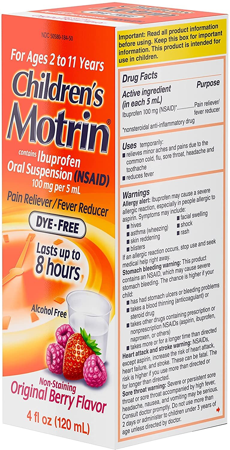 - 4-fluid ounces of Children’s Motrin Oral Suspension Liquid Medicine with Ibuprofen in a dye-free berry flavor to help temporarily reduce fever and relieve pain due to the common cold & flu