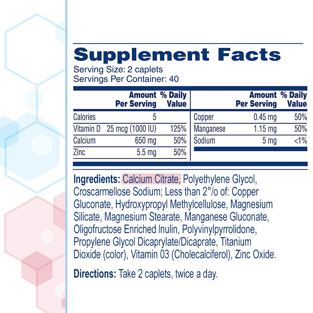 Active Ingredients: Calcium Citrate, Polyethylene Glycol, Croscarmellose Sodium; Less Than 2% of: Hydroxypropyl Methylcellulose, Magnesium Silicate, Magnesium Stearate, Manganese Gluconate, Oligofructose Enriched Inulin, Polyvinylpyrrolidone, Propylene Glycol Dicaprylate/Dicaprate, Titanium Dioxide (color), Vitamin D3 (Cholecalciferol), Zinc Oxide.