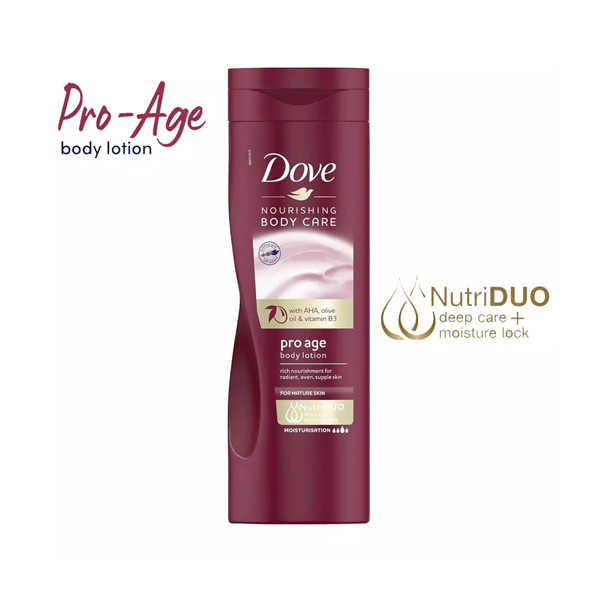 - Dove Pro Age Nourishing Body Care body Lotion contains AHA, olive oil and vitamin B3 for natural skin rejuvenation.