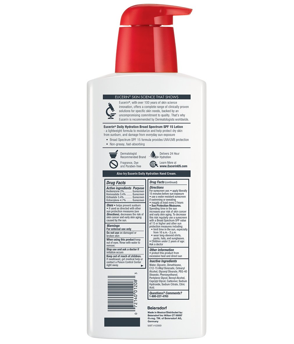 Eucerin Daily Hydration Lotion is a perfect everyday lotion that delivers 24 hour moisture for soft, healthy-looking skin. The light-weight, fast absorbing lotion contains Pro-Vitamin B5 that moisturizes to protect and heal skin. The non-greasy formula is also enriched with Sunflower Oil which is rich in antioxidants. Daily Hydration Lotion is fragrance and dye free. Eucerin Skin Science that Shows For over 100 years, Eucerin has pioneered skincare innovation, and today we are recognized and trusted by dermatologists as one of the leading and most recommended brands. Our products are designed to protect, repair, and enhance the health of skin – giving you and your family the feeling of confidence that comes from radiant, healthy looking skin.