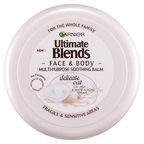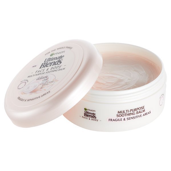 Our Garnier Ultimate Blends Body Delicate Oat Multi-Purpose Soothing Balm tailor-made for the fragile and sensitive areas on the face and body, with Oat Milk & White Almond Cream.