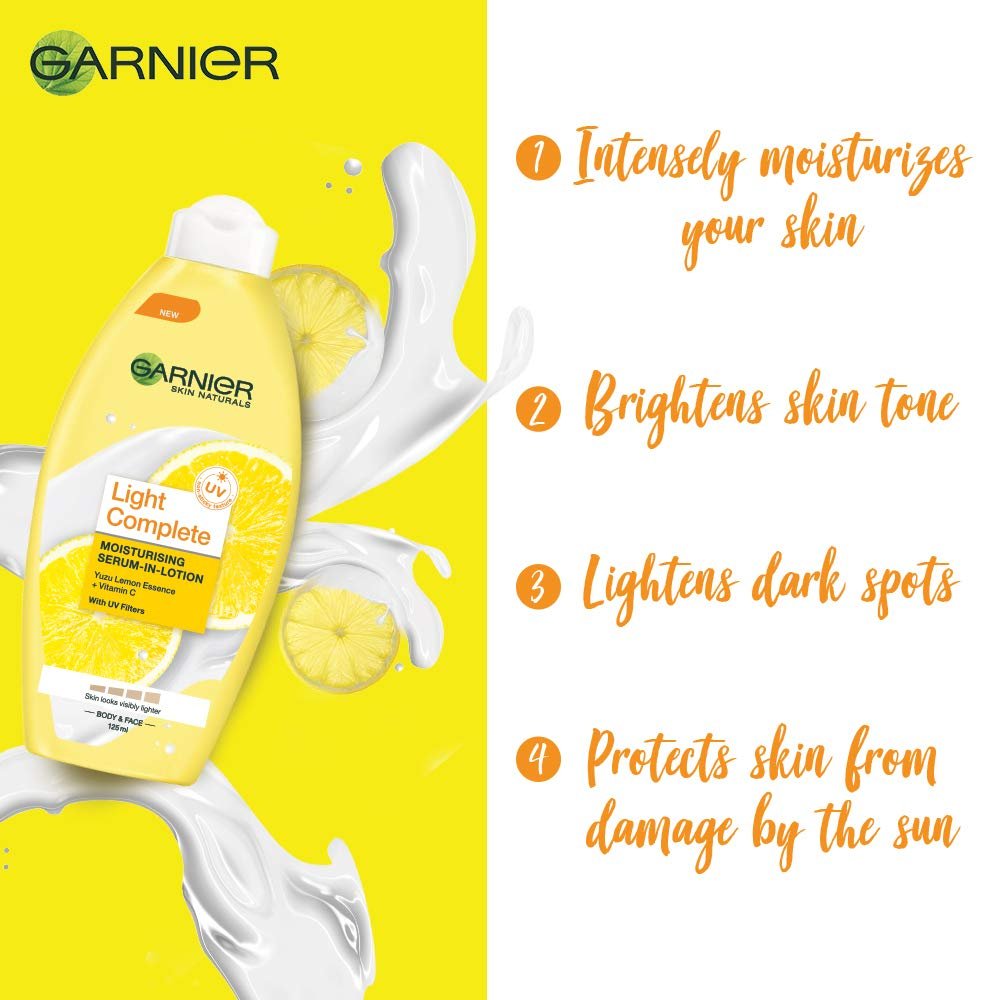- Garnier body lotion is lightweight serum-in-lotion is enriched with Yuzu Lemon Essence known to lighten dark spots and brighten skin tone.