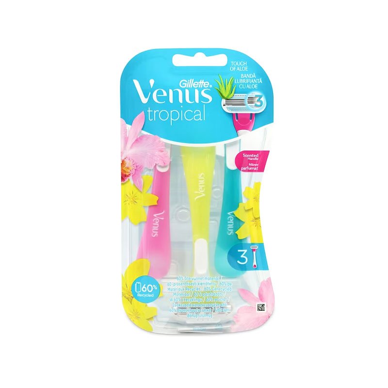 - Gillette Venus Tropical women’s disposable razors come in bright colours and with tropical scented handles.