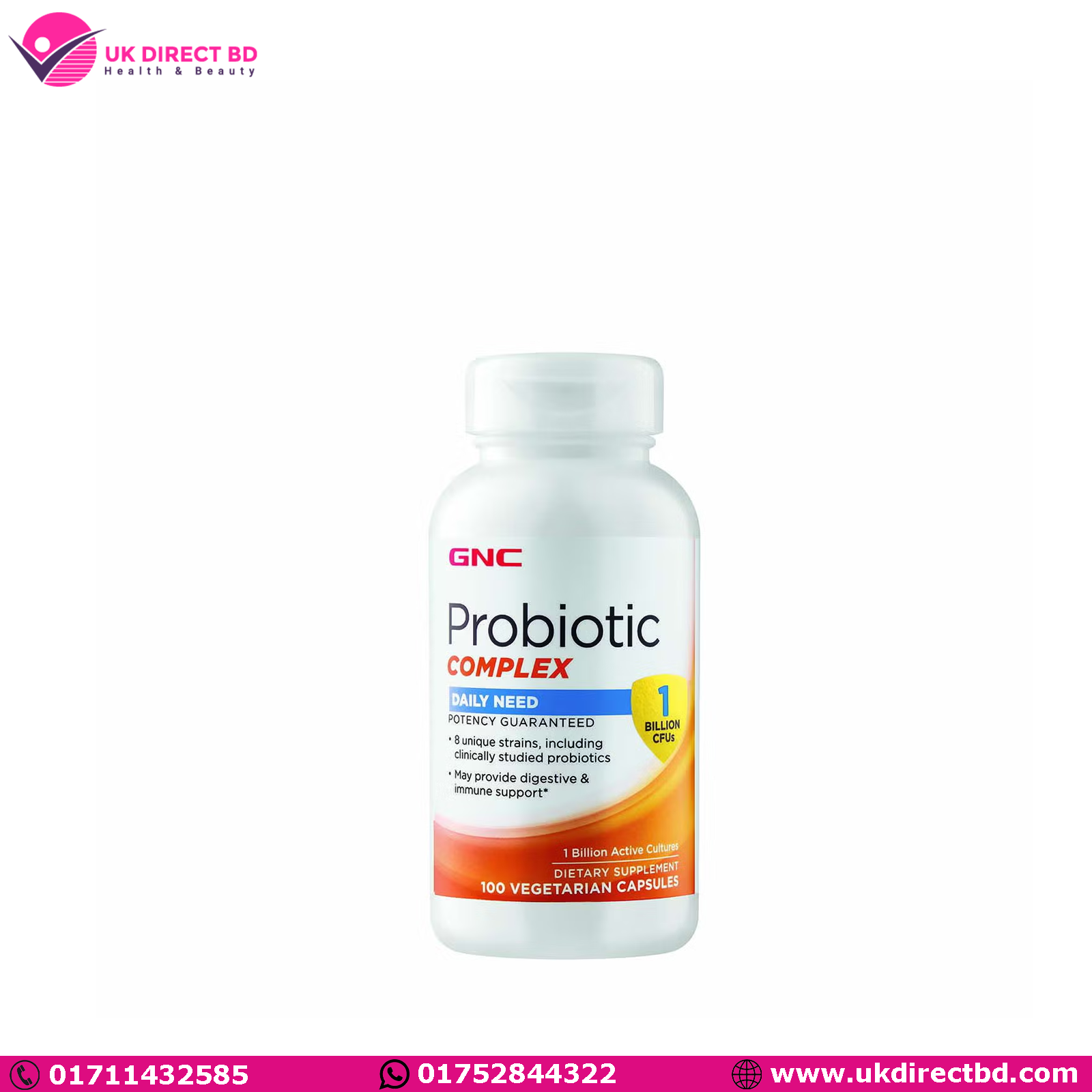 GNC Probiotic Complex Daily Need 1 Billion CFUs delivers 8 unique probiotic strains, including probiotics that have been clinically studied. Probiotics are beneficial bacteria that provide both digestive and immune support.* GNC’s probiotic products offer guaranteed potency, which means it has been tested to ensure the full 1 billion cultures in each dose are live and active when used by the expiration date – without the need for refrigeration! As a dietary supplement, take one capsule daily with food.