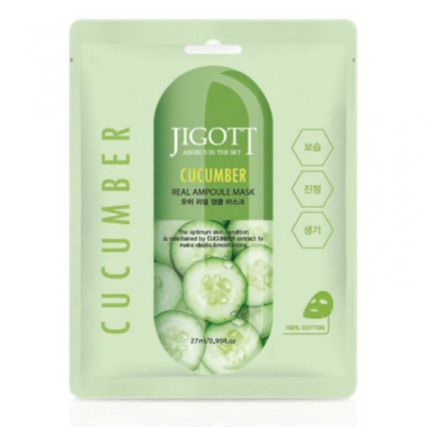 Jigott Cucumber Real Ampoule Mask moisturizes, evens and improves complexion. For the manufacture of the mask, natural, environmentally friendly cotton was used, which does not cause allergies and adheres perfectly to the skin