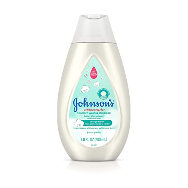 - 6.8-fluid ounce bottle of Johnson’s CottonTouch Newborn Baby Body Wash & Shampoo with No More Tears technology designed for your newborn baby’s sensitive skin
