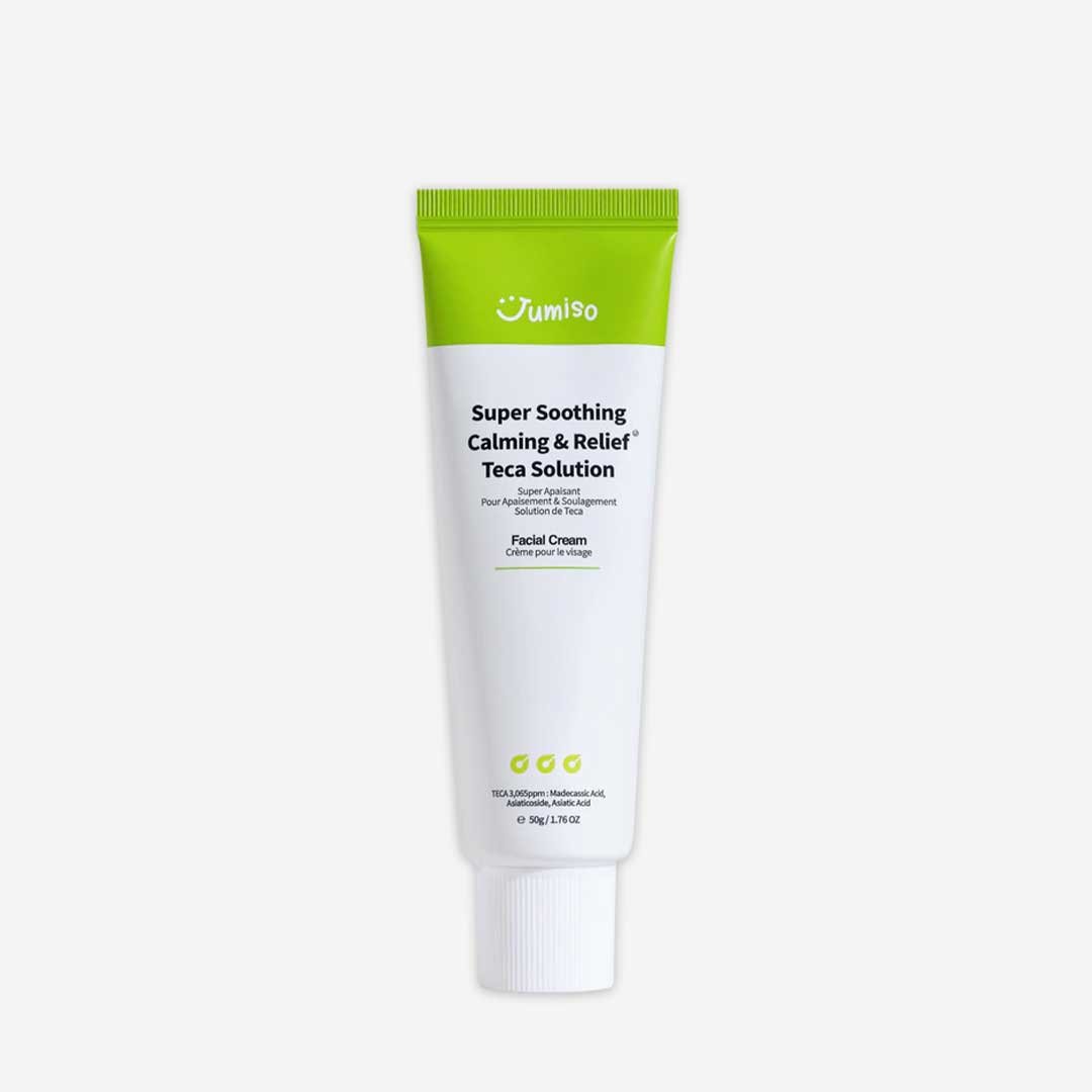 Jumiso Super Soothing Calming & Relief Teca Solution Facial Cream is a moisturizing cream that helps to soothe and calm irritated skin. It is formulated with centella asiatica, a popular ingredient in Korean skincare known for its calming and healing properties.The cream also contains tea tree leaf extract, which is known for its anti-inflammatory and antibacterial properties, and madecassoside, a compound derived from centella asiatica that helps to strengthen the skin barrier and promote healing.The cream has a lightweight, non-greasy texture that absorbs quickly into the skin. It is suitable for all skin types, especially those with sensitive and irritated skin.