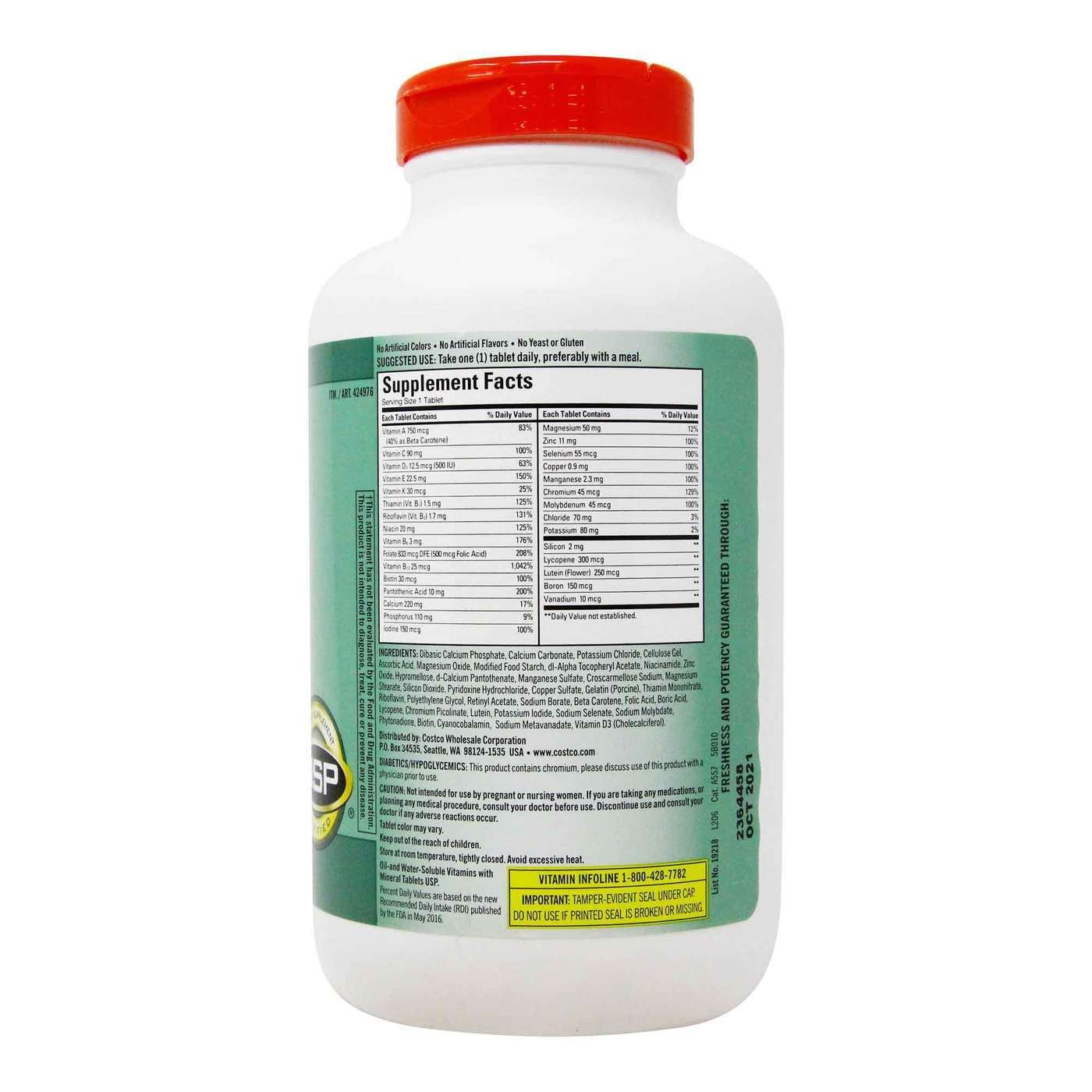 Other Ingredients: Dibasic Calcium Phosphate, Calcium Carbonate, Potassium Chloride, Cellulose Gel, Ascorbic Acid, Magnesium Oxide, dl-Alpha Tocopheryl Acetate, Starch (Corn & Tapioca), Niacinamide, Zinc Oxide, Hydroxypropyl Methylcellulose, d-Calcium Pantothenate, Gelatin, Manganese Sulfate, Croscarmellose Sodium, Magnesium Stearate, Silicon Dioxide, Pyridoxine Hydrochloride, Copper Sulfate, Thiamin Mononitrate, Riboflavin, Polyethylene Glycol, Beta Carotene, Vitamin A Acetate, Sodium Borate, Folic Acid, Boric Acid, Chromium Picolinate, Lycopene, Lutein, Potassium Iodide, Sodium Selenate, Sodium Molybdate, Phylloquinone, Biotin, Cyanocobalamin, Nickel Sulfate, Sodium Metavanadate, Vitamin D 3 (Cholecalciferol).