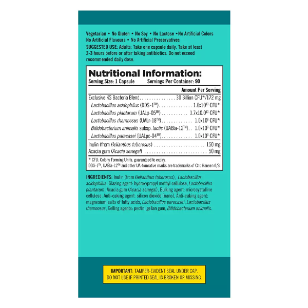Kirkland Signature ProbioPlus 30 Billion is a food supplement developed to support individuals by providing an exclusive Kirkland Signature Bacteria blend and containing lactic ferments, inulin and acacia gum. A serving of only one capsule a day provides 30 Billion colony forming active cells which are guaranteed to expiry. The Kirkland Signature ProbioPlus 30 Billion has been subject to robust, science-based testing methods. This allows Kirkland Signature to reliably and consistently supply a high quality, pure, and fully potent product.