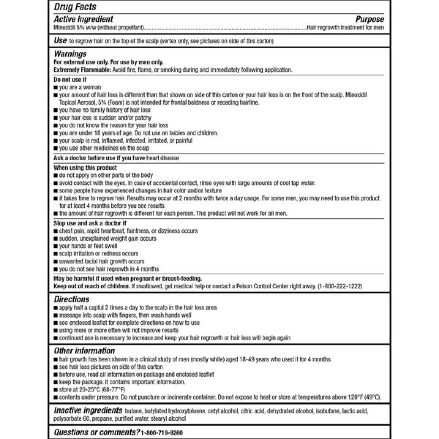 Minoxidil Topical Aerosol, 5% (Foam) is a hair regrowth treatment for men. The active ingredient is minoxidil 5%. This unscented, easy-to-use foam topical treatment revitalizes hair follicles and is clinically proven to help regrow hair. This product is not for use by women. It is not intended for frontal baldness or receding hairline. Minoxidil Topical Aerosol, 5% (Foam) is for men who have a general thinning of hair on the top of the scalp. About Hair Regrowth Treatment What is Minoxidil Topical Aerosol, 5%? Minoxidil Topical Aerosol, 5% is a white foam containing 5% minoxidil for use only on the scalp to help regrow hair in men. Who may use Minoxidil Topical Aerosol, 5%? Minoxidil Topical Aerosol, 5% is for use only by men. Minoxidil Topical Aerosol, 5% may be appropriate for you if you are a male at least 18 years old and experiencing gradually thinning hair or gradual hair loss on the top of the scalp. It is not intended for frontal baldness or a receding hairline. The common inherited thinning or hair loss process begins slowly and may become noticeable only after years of gradual loss. Minoxidil Topical Aerosol, 5% is for men with hair loss or thinning hair that begins on the vertex of the scalp. Many of those experiencing hair loss have other family members with gradually thinning hair or hair loss. If you have no family history of gradually thinning hair or of gradual hair loss, or your hair loss is patchy, see your doctor. How soon can I expect results from using Minoxidil Topical Aerosol, 5%? Since normal hair usually grows only 1/2 to 1 inch per month, hair regrowth with Minoxidil Topical Aerosol, 5% also takes time. Results may be seen as early as 2 months with twice daily use. For some men, it may take at least 4 months for results to be seen. If you do not see any results after 4 months, stop using Minoxidil Topical Aerosol, 5% and seek the advice of your physician.