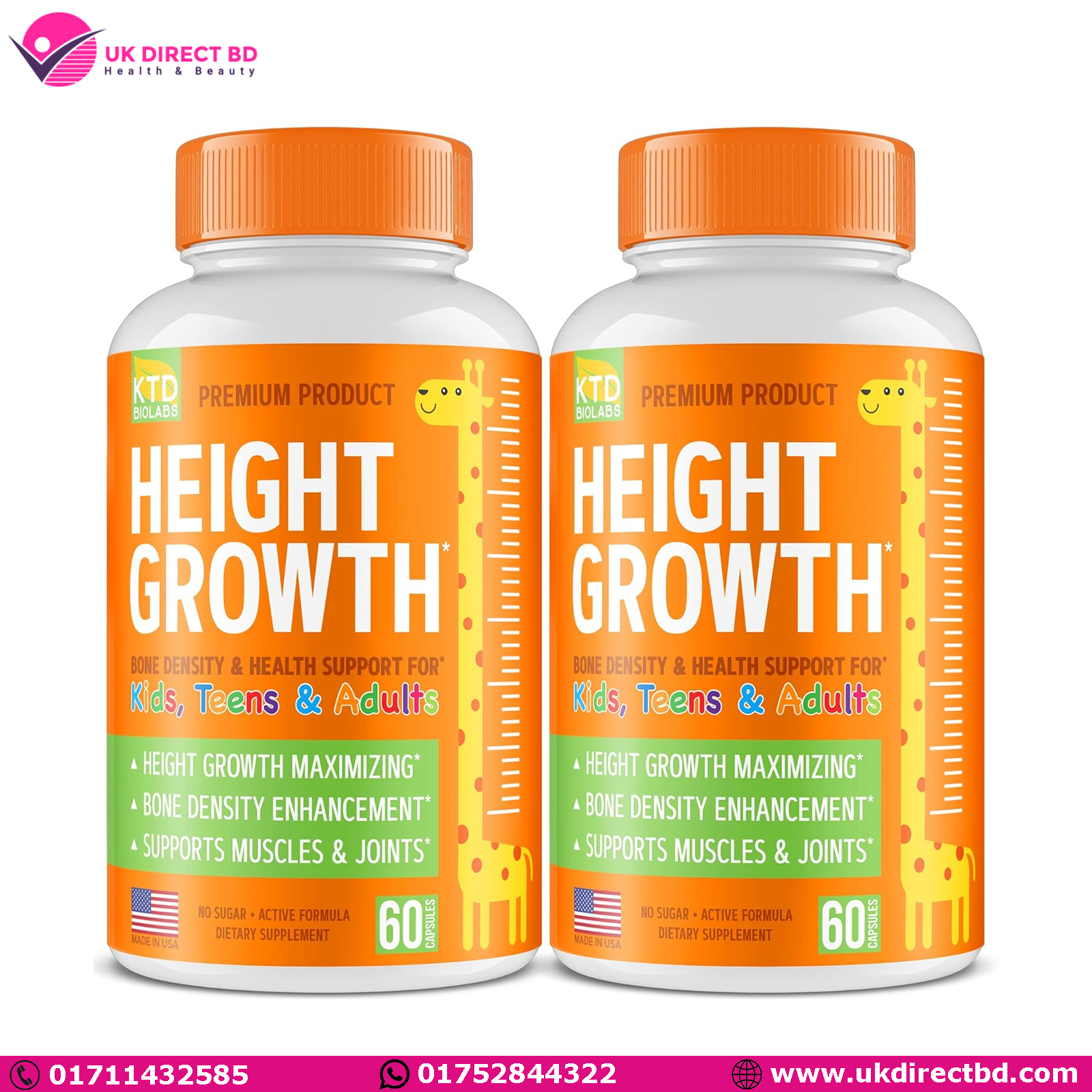 KTD BIOLABS Height Growth Maximizer – Natural Height Booster Teen Vitamins Made in USA Growth Pills to Reach Peak Height & Grow Taller Height Increase Pills for Adults & Kids Growth (Pack of 2)