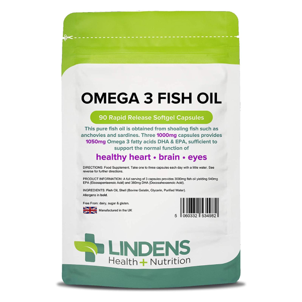 Lindens Omega 3 Fish Oil 1000mg Capsules | 90 Pack | 1050mg Omega 3 Fatty Acids Dha & Epa Per 3 Capsules and Supports Normal Function of Healthy Heart, Brain & Eyes