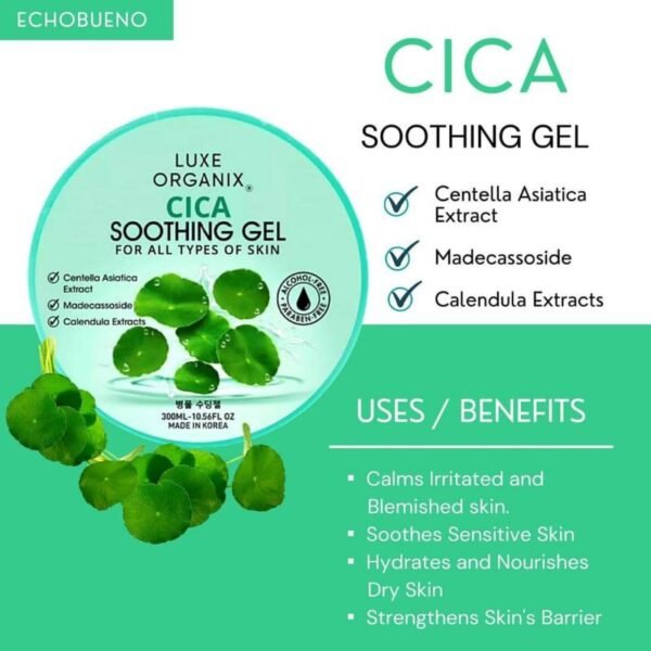 Luxe Organix Cica Soothing Gell calms irritated and blemished skin. It also hydrates and nourishes dry skin. Infused with Centella Asiatica Extract, Madecassoside, Calendula Extract that strengthens skin barrier,