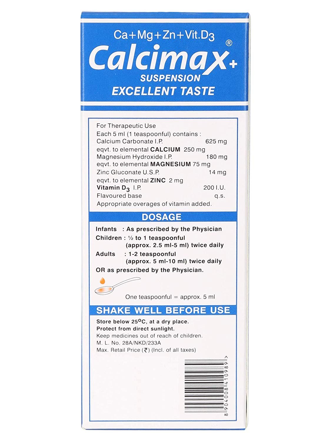 - Calcimax+ Suspension provides Calcium, Magnesium, Zinc, Vitamin D3 and essential micronutrients to help growing children to maintain strong bones.in D3