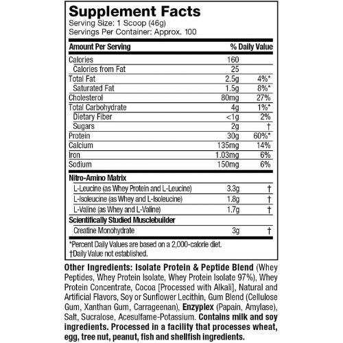 MuscleTech Nitro-Tech 10 lbs provides 30 grams of premium quality Whey Protein and 6.8 grams of branched-chain amino acids (BCAAs), which are among the essential amino acids for muscle growth and recovery. Plus, this protein powder contains 3 grams of creatine monohydrate, which can help you increase strength, power, and lean muscle mass.