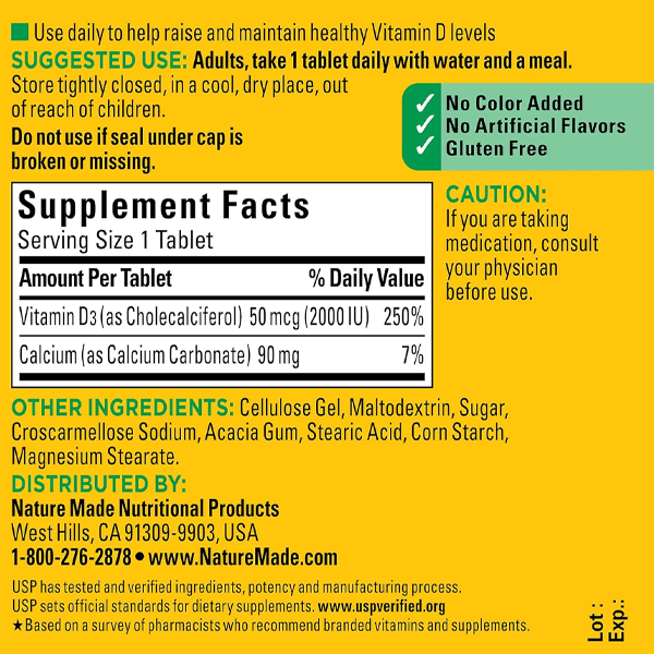 Nature Made Vitamin D3 2000 IU Tablets (50 mcg) offer an easy way to add Vitamin D supplements to your daily routine to support bone, teeth and muscle health. Sourced from high quality ingredients, these Nature Made Vitamin D tablets are gluten free dietary supplements with no color added and no artificial flavors. Each Vitamin D3 2000IU tablet supports a healthy immune response and aids in calcium absorption. Vitamin D is a common nutrient shortfall. D3 vitamin is the body’s preferred form of Vitamin D to help maintain Vit D levels. These Nature Made Vitamin D3 supplements contain 50mcg (2000 IU) of Vit D3 per serving. Adults, take one Vitamin D3 Nature Made tablet daily with water and a meal. This Nature Made Vitamin D supplement is quality you can trust. USP has tested and verified ingredients, potency and manufacturing process. USP sets official standards for dietary supplements. Visit the USP verified website for more information. *Based on a survey of pharmacists who recommend branded vitamins and supplements.