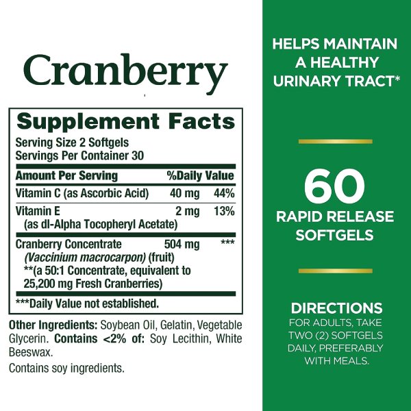 Our unique Triple Strength Cranberry Concentrate contains the equivalent of 25,200 mg per serving offresh Cranberry fruit**, so two softgels daily are all you need! Cranberries are known for their ability to help maintain a healthy urinary tract.* This product also contains Vitamin C to support antioxidant and immune health, plus Vitamin E, an essential nutrient crucial for good health.*