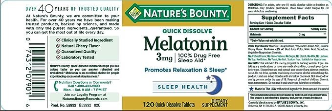 - Melatonin helps promote a tranquil sleep so you can awaken refreshed and revitalizied.* Nature’s Bounty® Quick Dissolve Melatonin is a terrific choice if you experience occasional sleeplessness or jet lag, or if you want to improve your quality of rest.* Melatonin helps you fall asleep faster and stay asleep longer.* Just place the quick dissolve tablet under your tongue for 30 seconds before swallowing. You’ll enjoy the bust of great natural cherry flavor and the benefits of Melatonin!