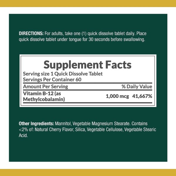 Support energy metabolism, heart, and nervous system health with Nature’s Bounty® B-12 Methylcobalamin.* Each serving delivers 1000 mcg of Methylcobalamin, the advanced, active form of Vitamin B-12, which aids in the conversion of food into cellular energy.* Contains 60 quick dissolve tablets in natural cherry flavor.