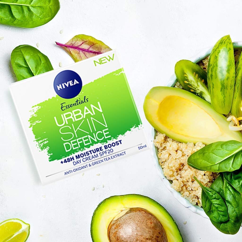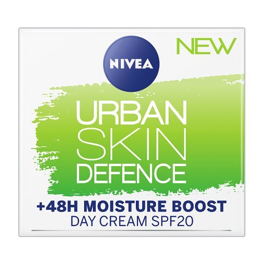 NIVEA Daily Essentials URBAN SKIN DEFENCE +48H MOISTURE BOOST Day Cream helps protect skin from external influences, pollution and sunlight with SPF 20. Providing skin with 48h moisture, this protective skin care cream comes with bio green tea extract and anti-oxidant.