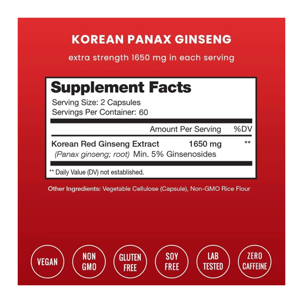 Our Korean Panax Ginseng is made with high-quality, sustainably sourced ginseng roots that are carefully processed to preserve their active compounds. Each capsule is standardized to contain a minimum of 5% ginsenosides, which are the key active ingredients in ginseng.