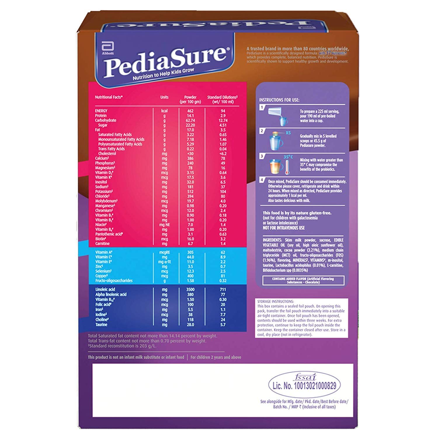 Serving suggestion– Add 2 Scoops of PediaSure health drink powder to 150 ml of whole milk, Recommended number of servings for your kid – 2 servings per day, For Consumption in water add 5 scoops of PediaSure health drink powder to 190 ml of water