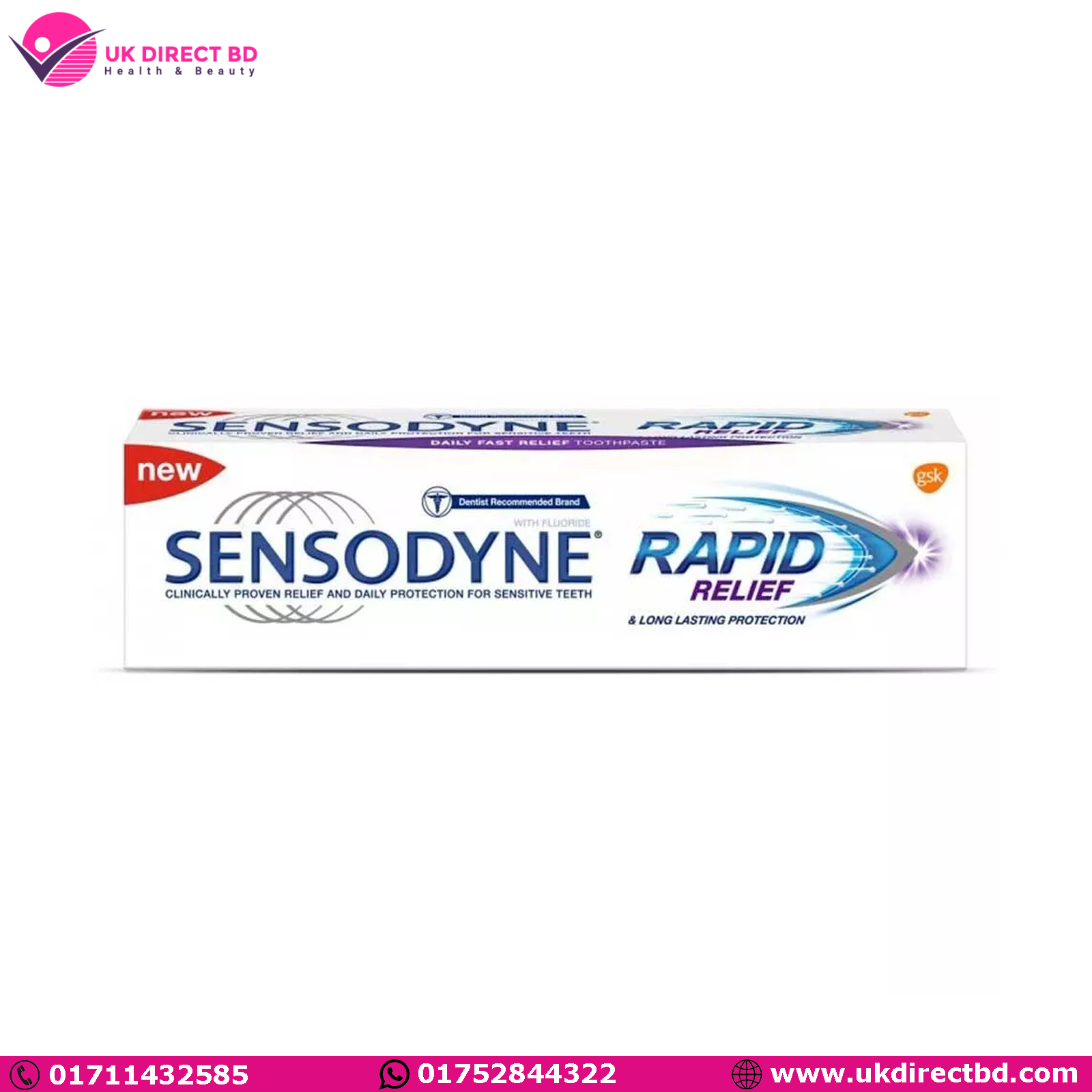 Buy Sensodyne Rapid Relief Toothpaste 100g online from Cellsii.com. Sensodyne Rapid Relief toothpaste works to beat tooth sensitivity pain fast, and with twice daily brushing, is proven to help relieve tooth sensitivity, also known as dentin hypersensitivity, in just 3 days. Its unique formula quickly creates a barrier over exposed dentin to help keep outside triggers from reaching the tooth nerves.