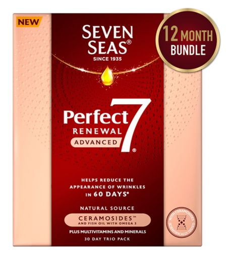 Seven Seas Perfect7 Renewal Advanced contains Ceramosides, a natural source of ceramides, that help reduce the appearance of wrinkles in 60 days. It also contains a comprehensive multivitamin and mineral tablet to support overall health and well being, and a Seven Seas Omega-3 capsule.