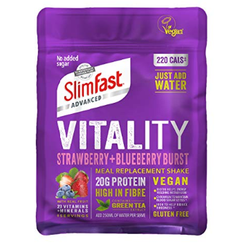 SlimFast Advanced VITALITY Discover a holistic way to lose weight helping you to feel great on the inside and out. Our unique Vitality shake recipe is made with selected ingredients to boost your metabolism and reduce tiredness and fatigue – essential when losing weight and keeping it off.With no added sugar, high in protein and fibre and with 23 vitamins and minerals in every serving, it’s perfect whether you are on a diet or looking for a balanced meal alternative.Give it a go and see what you could achieve.SlimFast 3.2.1 Plan It’s simple, easy to stick to and scientifically proven to work*. Pick 3 snacks a day. SlimFast snacks or fruit & veg Choose 2 SlimFast meal replacements – shakes or bars Have 1 balanced 600kcal meal (800kcal for men) Drink at least 2 litres of water a day Get active! Exercise could help you reach your goal To prepare your shake: Take 250ml of cold waterAdd 4 level scoops of powder to the water (scoop in bag) Cover and shake well for approximately 20 seconds For Best results use a blender and ice