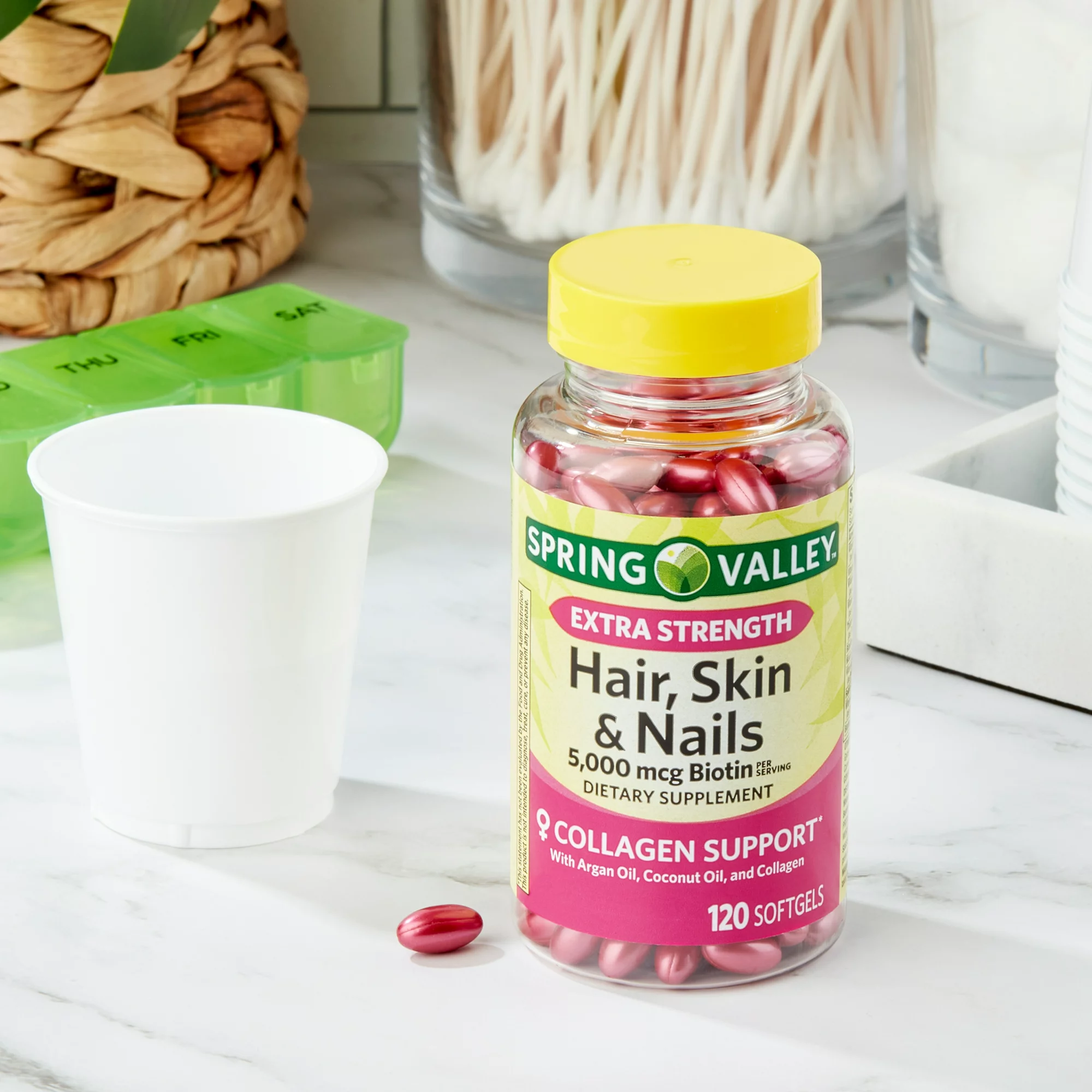 *This statement has not been evaluated by the Food and Drug Administration. This product is not intended to diagnose, treat, cure, or prevent any disease.Spring Valley Extra Strength Biotin Hair, Skin & Nails Dietary Supplement, 5,000 mcg are dietary supplements that promote collagen support. Each serving provides 5000 micrograms of biotin, as well as 14 key vitamins and minerals, in addition to argan oil, coconut oil, and collagen. The suggested adult dosage is three softgels daily, preferably with a meal. You can rest assured that Spring Valley Extra Strength Biotin Hair, Skin & Nails Dietary Supplement, 5,000 mcg are produced with strict quality guidelines and are backed by our quality guarantee.