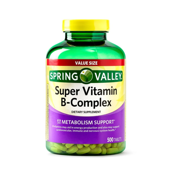 - Our Spring Valley Super Vitamin B-Complex Tablets Dietary Supplement is formulated for energy metabolism support.* It supplies a blend of vitamins B6, B12, C, thiamine, biotin, folate, pantothenic acid, and riboflavin. B-vitamins may support energy production and promote cardiovascular, immune, and nervous system health.* This formula contains no gluten, lactose, artificial colors or flavors. The suggested adult dosage is one tablet daily, preferably with a meal. You can rest assured that Spring Valley Super Vitamin B-Complex Tablets 500 Count are produced with strict quality guidelines and backed by our quality guarantee.
