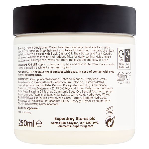 Superdrug Leave-in Conditioning Cream has been specially developed and salon tested for dry, coarse and frizzy hair and is suitable for hair that is natural, chemically treated or coloured. Enriched with Black Castor Oil, Shea Butter and Plant Keratin, this leave-in treatment adds shine and reduces frizz for daily styling. Helps reduce the appearance of damage and leaves hair more manageable and easy to style.