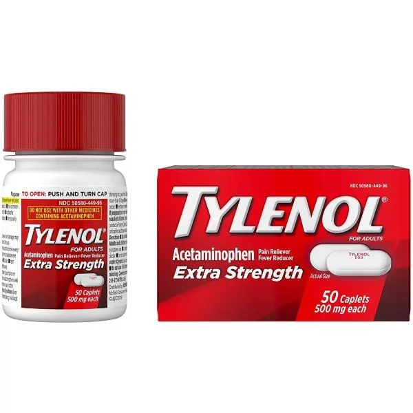 50-count of Tylenol Extra Strength Caplets with 500mg of acetaminophen to provide temporary relief of minor aches and pains and help reduce fever