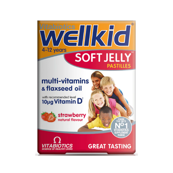 Vitabiotics Wellkid Soft Jelly Pastilles come in a tasty strawberry flavour chewable tablet. A perfect multi-vitamin for your child with multi vitamins, flaxseed oil, the full range of B complex vitamins plus Vitamin C, D and E.