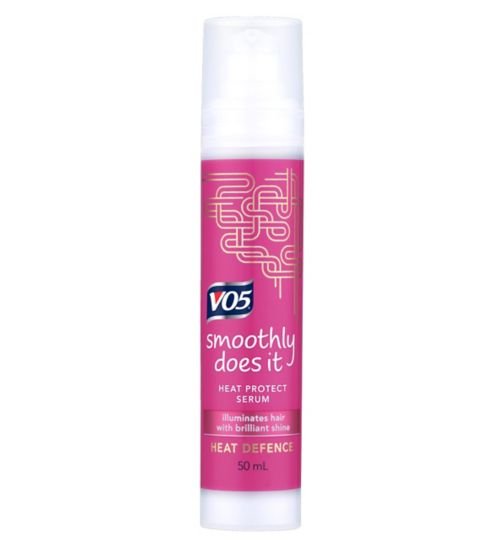 Vo5 Smooth Heat Protect Serum creates shine, controls frizz and flyaways.