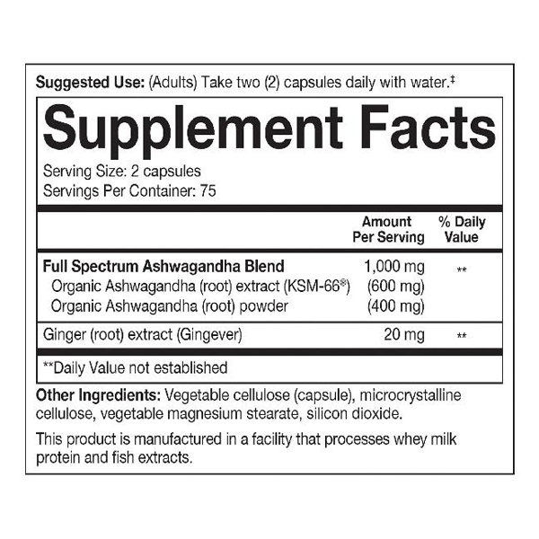 - Organic Ashwagandha extract KSM-66 and Organic Ashwagandha root powder, infused with ginger extract – a potent bioenhancer that helps the body absorb andutilize nutrients.